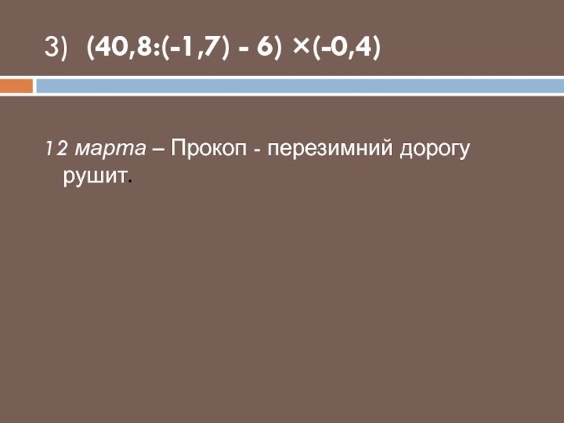 3) (40,8:(-1,7) - 6) ×(-0,4) 12 марта – Прокоп - перезимний дорогу рушит.