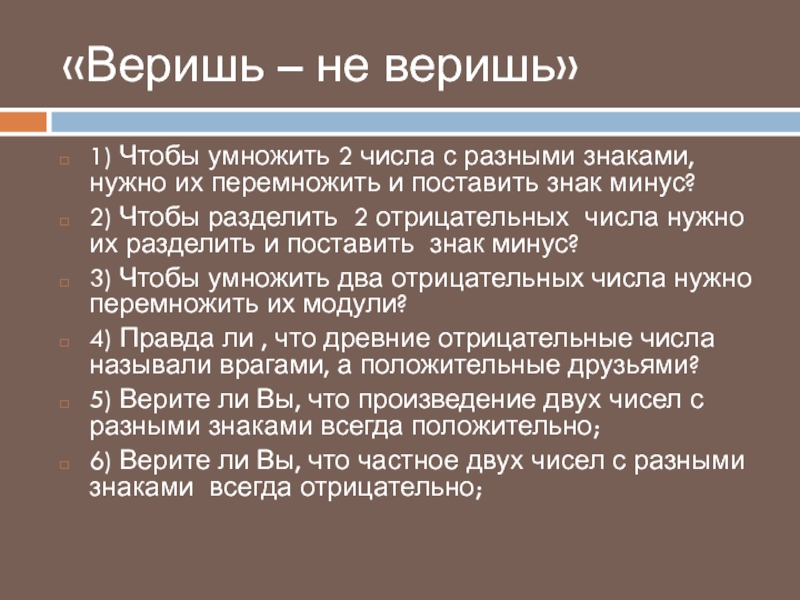 «Веришь – не веришь»1) Чтобы умножить 2 числа с разными знаками, нужно их перемножить и поставить знак