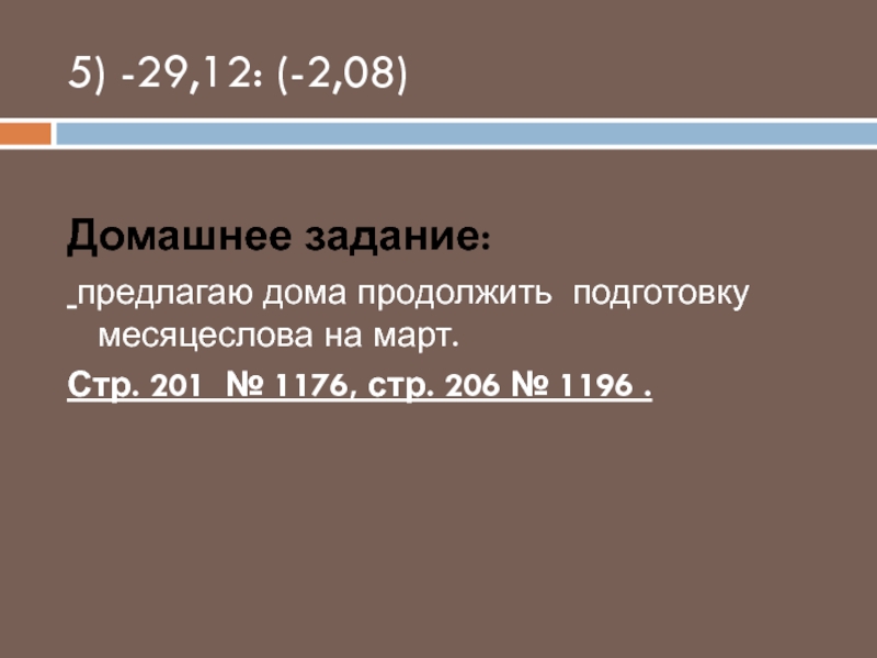 5) -29,12: (-2,08) Домашнее задание:  предлагаю дома продолжить подготовку месяцеслова на март.Стр. 201 № 1176, стр.