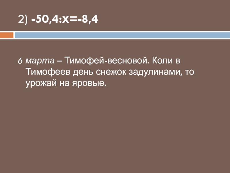2) -50,4:х=-8,4 6 марта – Тимофей-весновой. Коли в Тимофеев день снежок задулинами, то урожай на яровые.