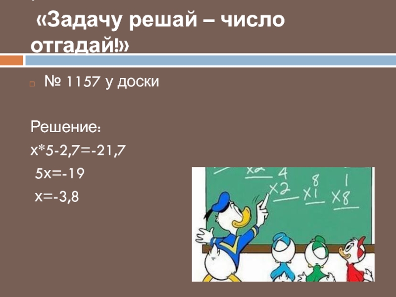 .  «Задачу решай – число отгадай!» № 1157 у доски Решение: х*5-2,7=-21,7   5х=-19