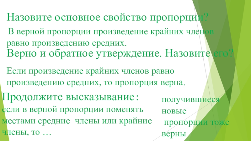 Продолжите высказывание : если в верной пропорции поменять местами средние члены или крайние члены, то …