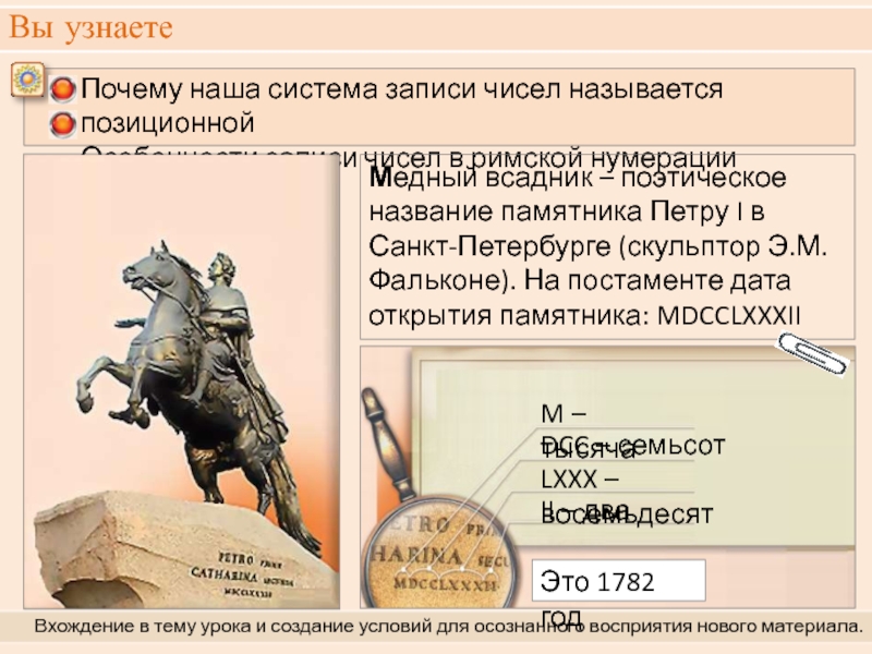 Медный всадник – поэтическое название памятника Петру I в Санкт-Петербурге (скульптор Э.М. Фальконе). На постаменте дата открытия памятника: MDCCLXXXII