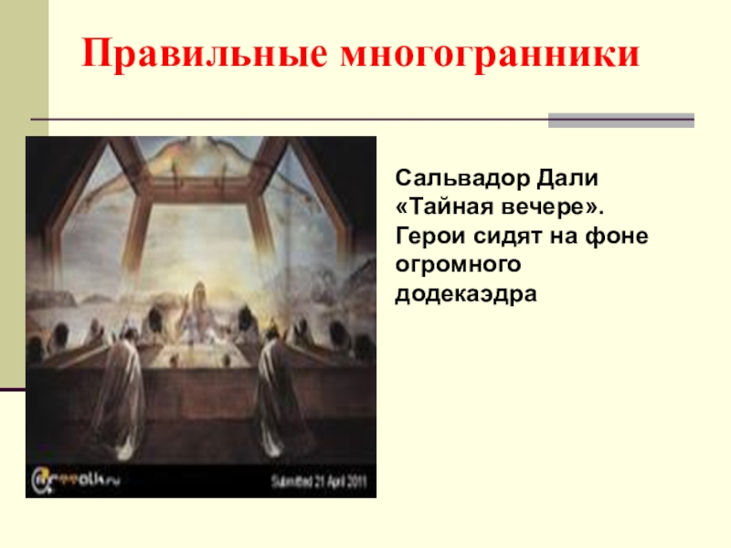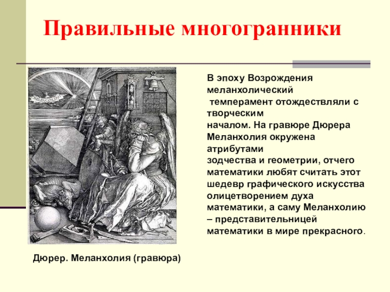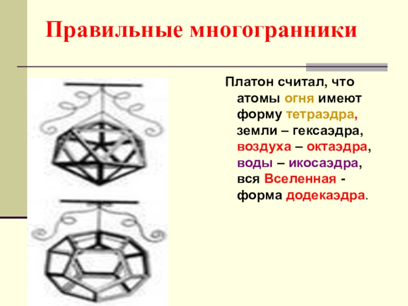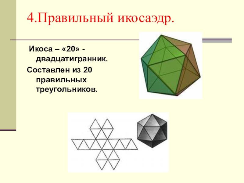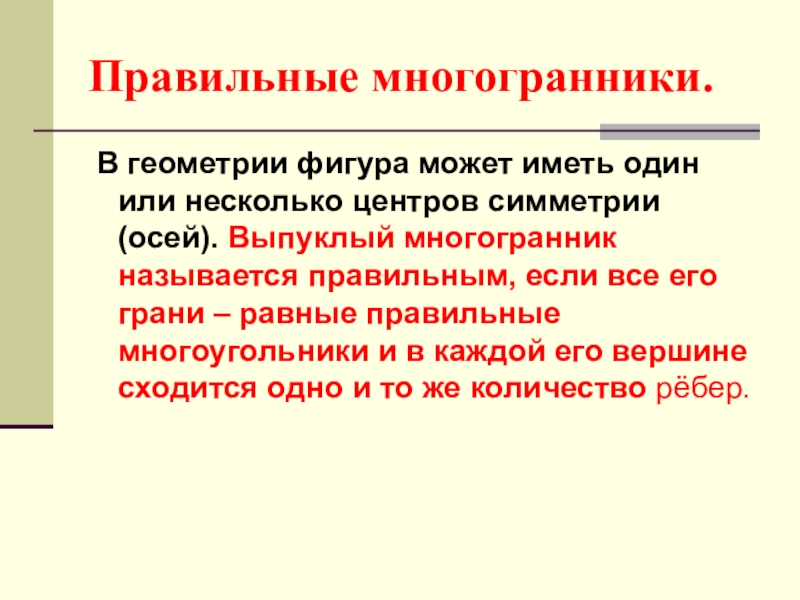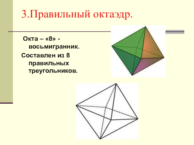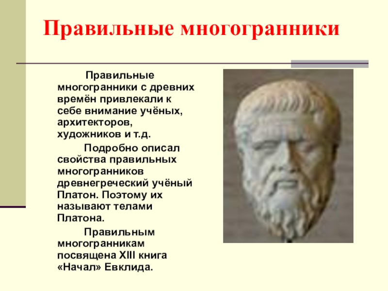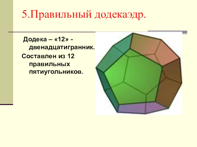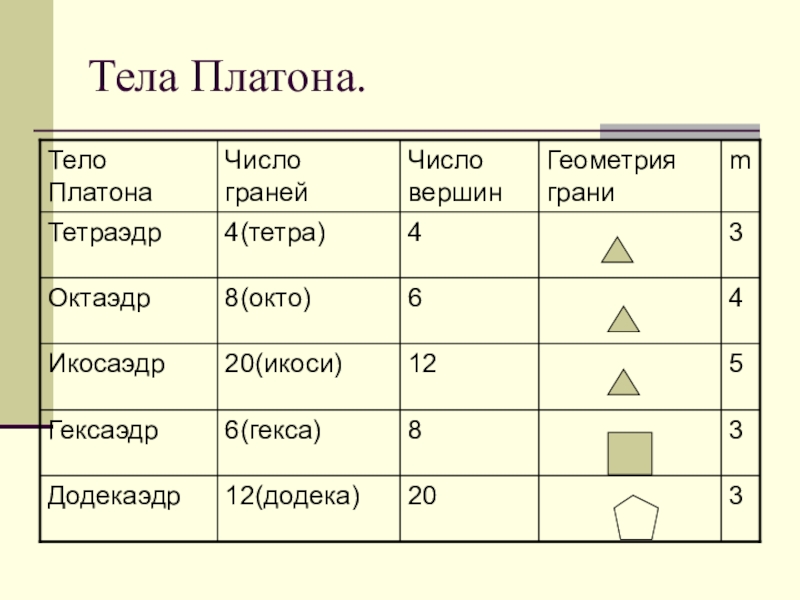 По этой же причине каждая вершина правильного многогранника может быть вершиной 3, 4, 5 правильных треугольников, 3 квадратов или 3 правильных пятиугольников. Значит, есть только 5 правильных многогранников.