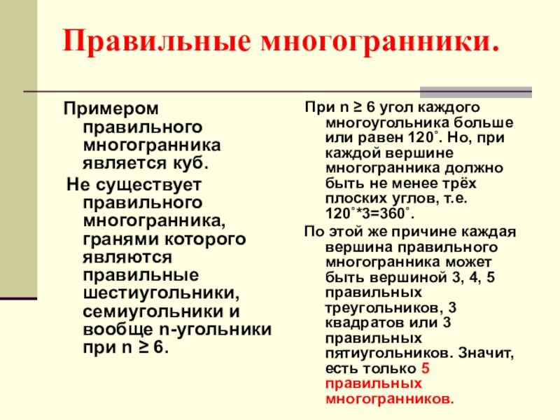 При n ≥ 6 угол каждого многоугольника больше или равен 120˚. Но, при каждой вершине многогранника должно быть не менее трёх плоских углов, т.е. 120˚*3=360˚.