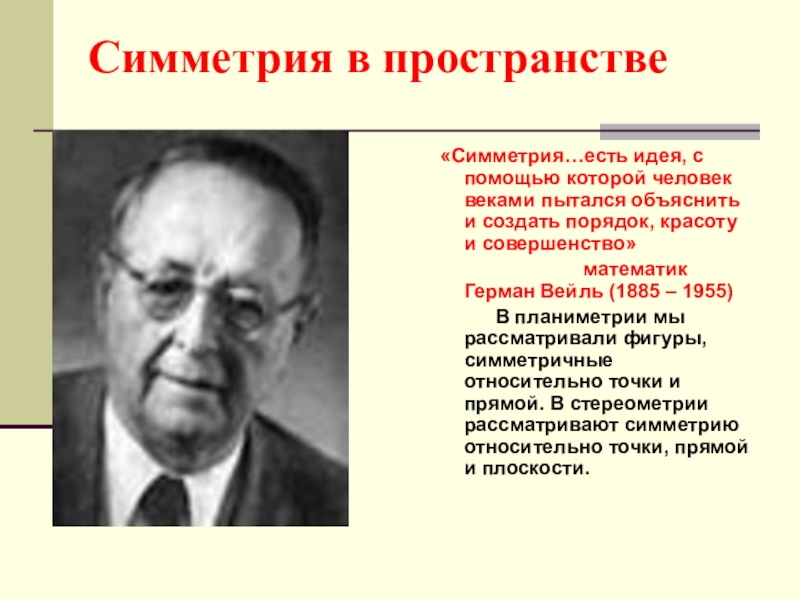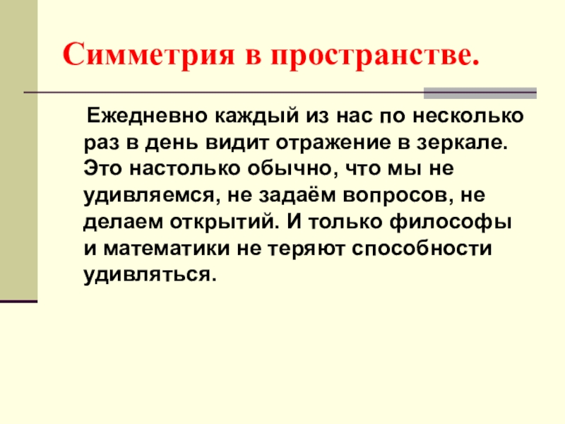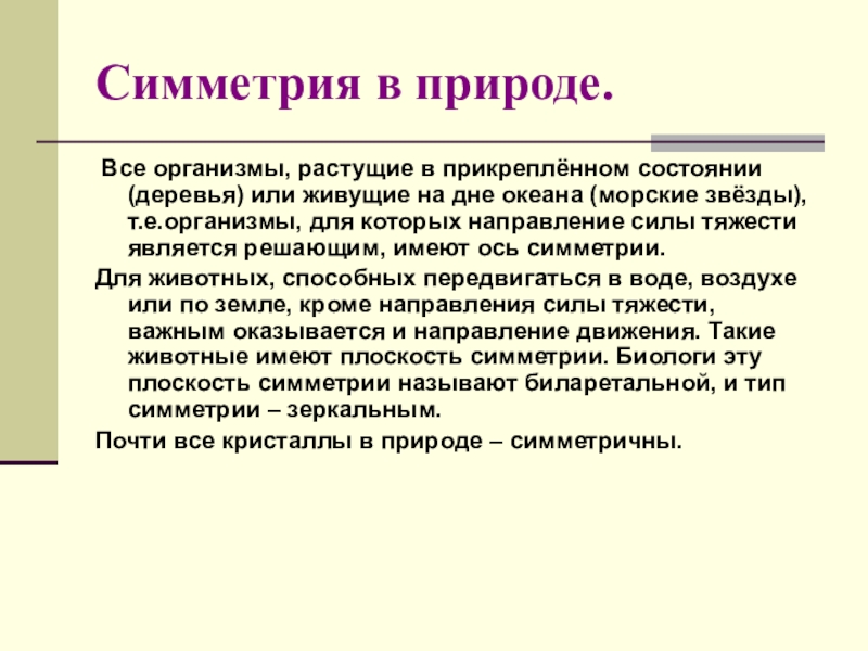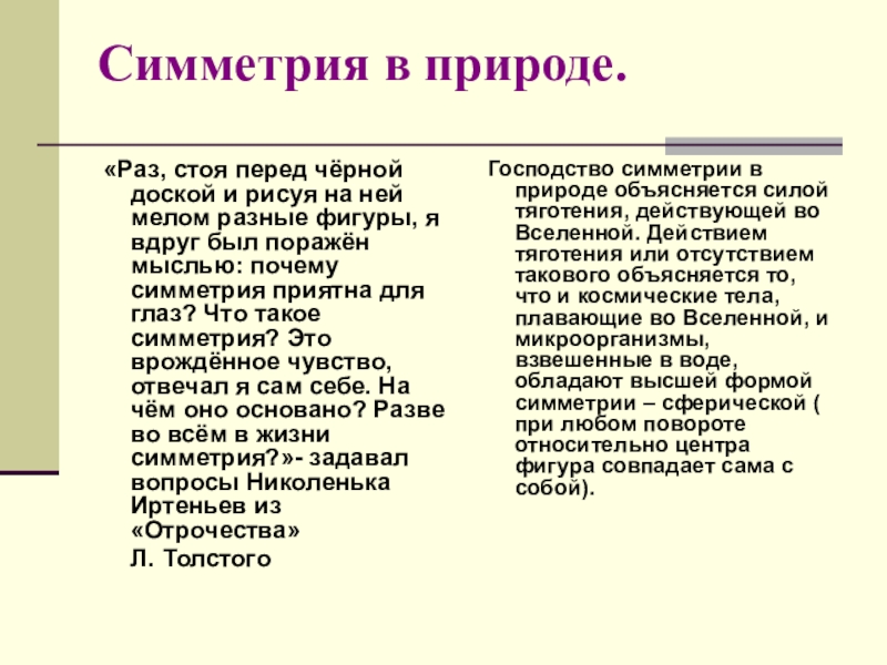 Господство симметрии в природе объясняется силой тяготения, действующей во Вселенной. Действием тяготения или отсутствием такового объясняется то, что и космические тела, плавающие во Вселенной, и микроорганизмы, взвешенные в воде, обладают высшей формой симметрии – сферической ( при любом повороте относительно центра фигура совпадает сама с собой).
