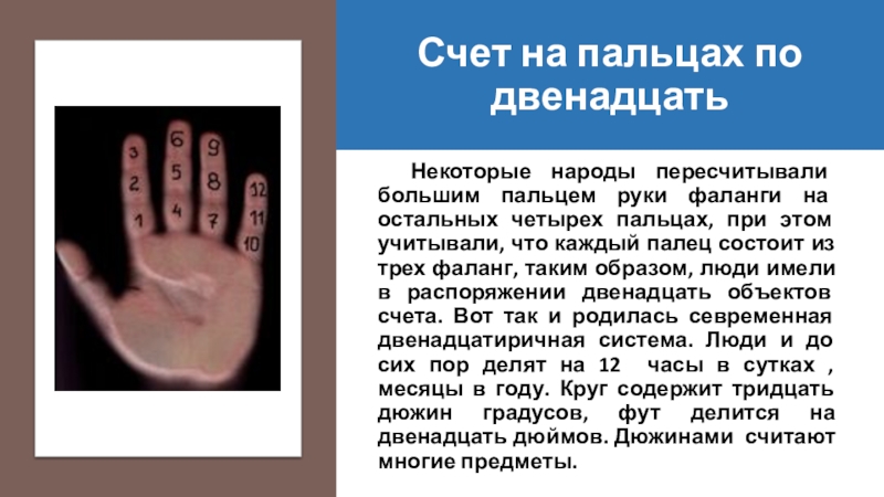на остальных четырех пальцах, при этом учитывали, что каждый палец состоит из трех фаланг, таким образом, люди имели в распоряжении двенадцать объектов счета. Вот так и родилась севременная двенадцатиричная система. Люди и до сих пор делят на 12 часы в сутках , месяцы в году. Круг содержит тридцать дюжин градусов, фут делится на двенадцать дюймов. Дюжинами считают многие предметы.