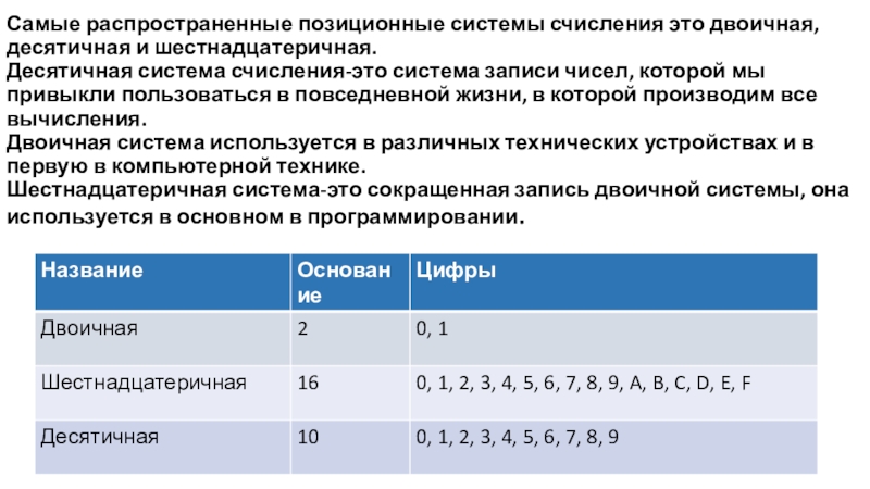 Слайд 12Самые распространенные позиционные системы счисления это двоичная, десятичная и шестнадцатеричная.