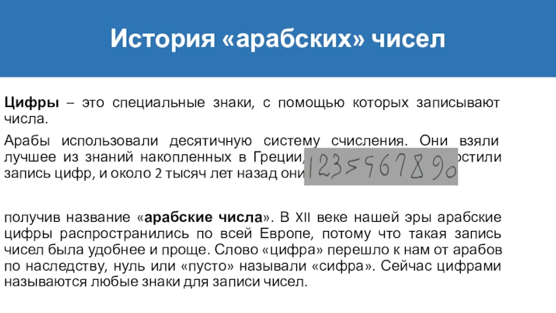 получив название «арабские числа». В XII веке нашей эры арабские цифры распространились по всей Европе, потому что такая запись чисел была удобнее и проще. Слово «цифра» перешло к нам от арабов по наследству, нуль или «пусто» называли «сифра». Сейчас цифрами называются любые знаки для записи чисел.