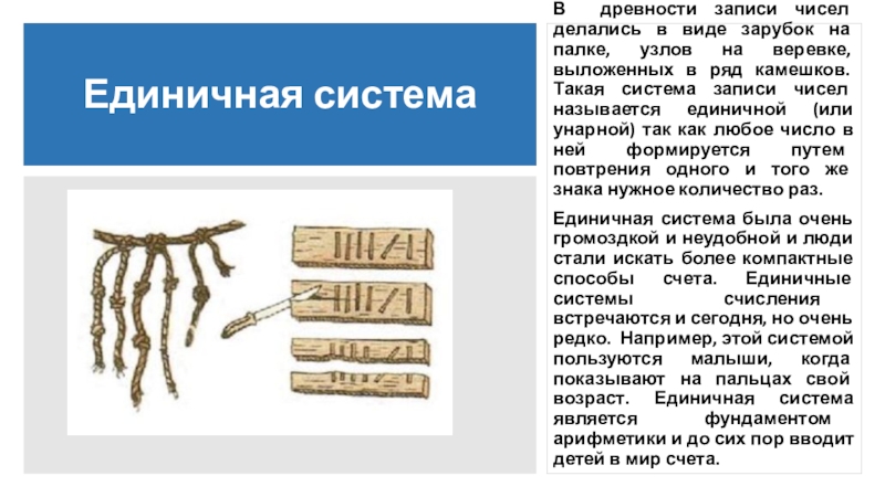 узлов на веревке, выложенных в ряд камешков. Такая система записи чисел называется единичной (или унарной) так как любое число в ней формируется путем повтрения одного и того же знака нужное количество раз.
