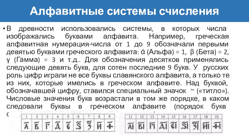 алфавита. Например, греческая алфавитная нумерация-числа от 1 до 9 обозначали первыми девятью буквами греческого алфавита: ά (Альфа) = 1, β (Бета) = 2, γ (Гамма) = 3 и т.д.. Для обозначения десятков применялись следующие девять букв, для сотен последние 9 букв. У русских роль цифр играли не все буквы славянского алфавита, а только те из них, которые имелись в греческом алфавите. Над буквой, обозначавшей цифру, ставился специальный значок ~ («титло»). Числовые значения букв возрастали в том же порядке, в каком следовали буквы в греческом алфавите (порядок букв славянского алфавита был несколько иным)