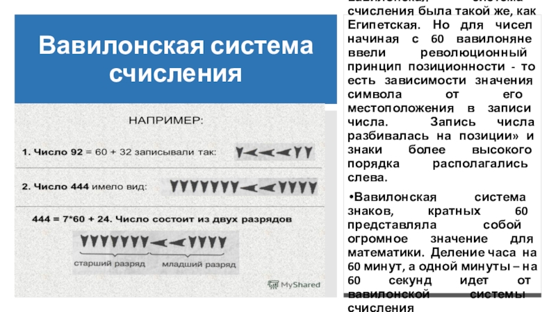 Вавилонская система знаков, кратных 60 представляла собой огромное значение для математики. Деление часа на 60 минут, а одной минуты – на 60 секунд идет от вавилонской системы счисления