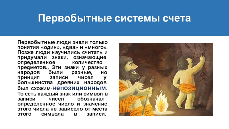 Позже люди научились считать и придумали знаки, означающие определенное количество предметов., Эти знаки у разных народов были разные, но принцип записи чисел у большинства древних народов был схожим-непозиционным. То есть каждый знак или символ в записи чисел обозначал определенное число и значение этого числа не зависело от места этого символа в записи.