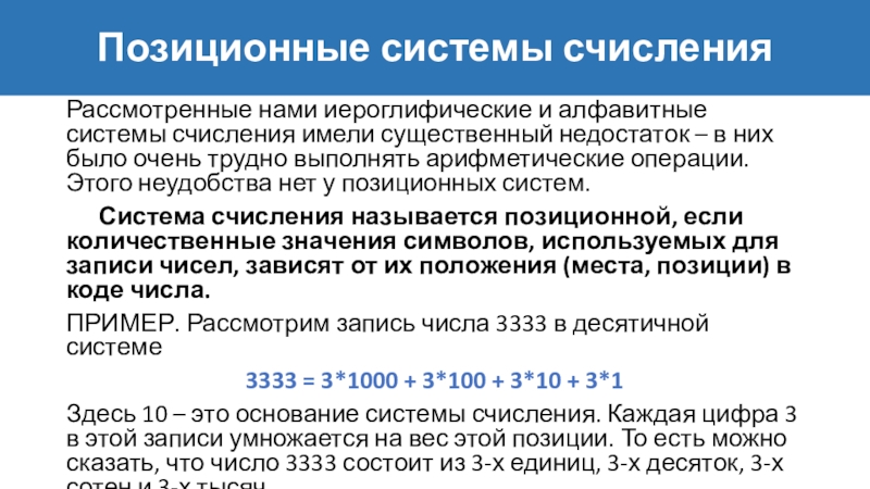недостаток – в них было очень трудно выполнять арифметические операции. Этого неудобства нет у позиционных систем.