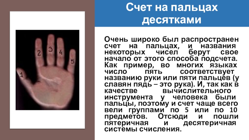 названия некоторых чисел берут свое начало от этого способа подсчета. Как пример, во многих языках число пять соответствует названию руки или пяти пальцев (у славян пядь – это рука). И, так как в качестве вычислительного инструмента у человека были пальцы, поэтому и счет чаще всего вели группами по 5 или по 10 предметов. Отсюди и пошли пятеричная и десятеричная системы счисления.