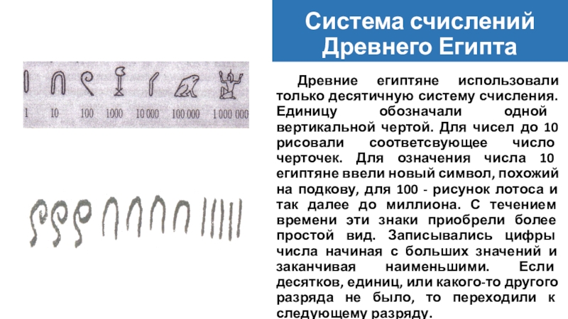 обозначали одной вертикальной чертой. Для чисел до 10 рисовали соответсвующее число черточек. Для означения числа 10 египтяне ввели новый символ, похожий на подкову, для 100 - рисунок лотоса и так далее до миллиона. С течением времени эти знаки приобрели более простой вид. Записывались цифры числа начиная с больших значений и заканчивая наименьшими. Если десятков, единиц, или какого-то другого разряда не было, то переходили к следующему разряду.