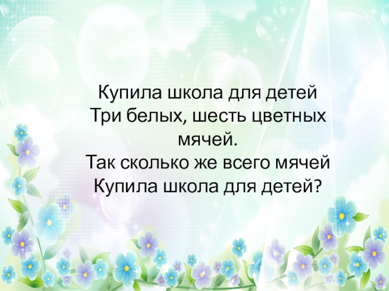 Слайд 5Купила школа для детей Три белых, шесть цветных мячей. Так сколько же всего