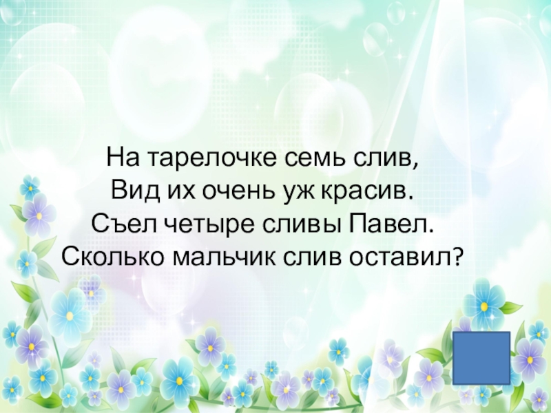 Слайд 8На тарелочке семь слив, Вид их очень уж красив. Съел четыре сливы Павел. Сколько