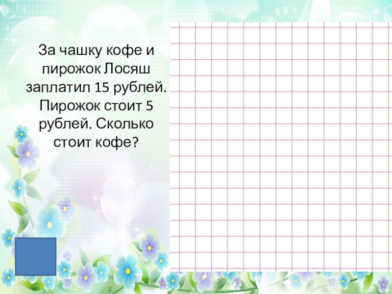 Слайд 11За чашку кофе и пирожок Лосяш заплатил 15 рублей. Пирожок стоит