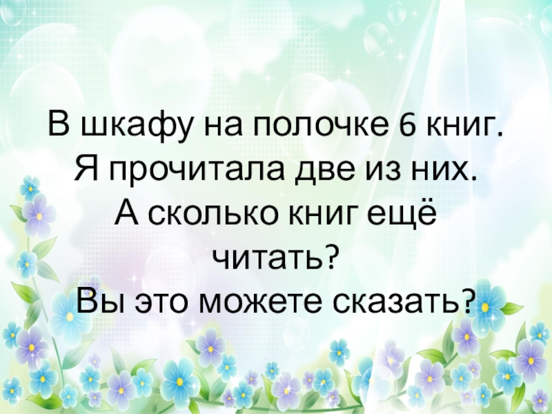 Слайд 7В шкафу на полочке 6 книг. Я прочитала две из них. А сколько