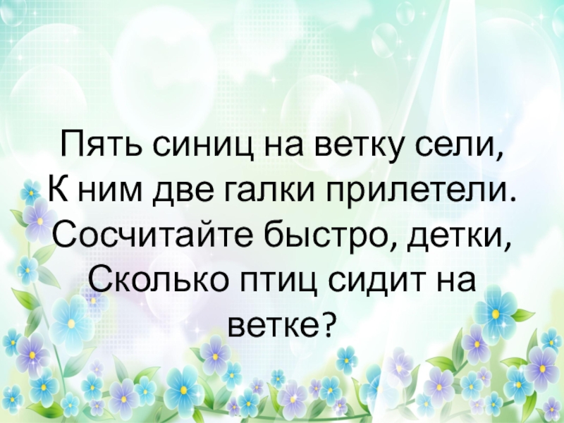 Пять синиц на ветку сели, К ним две галки прилетели. Сосчитайте быстро, детки, Сколько птиц сидит на