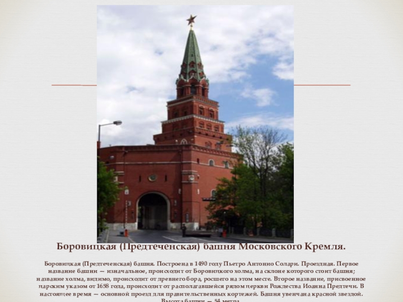 Слайд 12Боровицкая (Предтеченская) башня Московского Кремля. Боровицкая (Предтеченская) башня. Построена в 1490 году