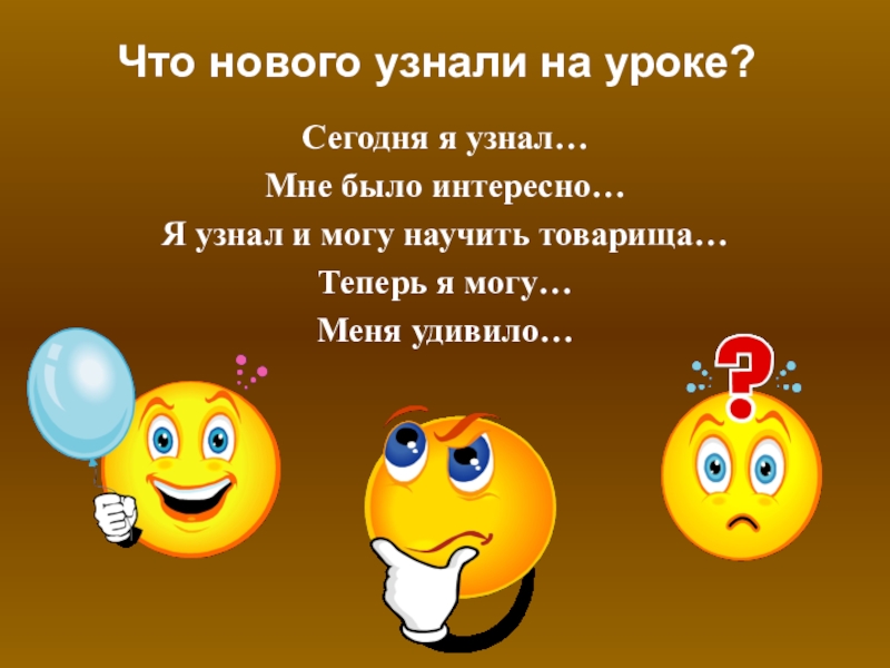 Что нового узнали на уроке?  Сегодня я узнал…Мне было интересно…Я узнал и могу научить товарища…Теперь