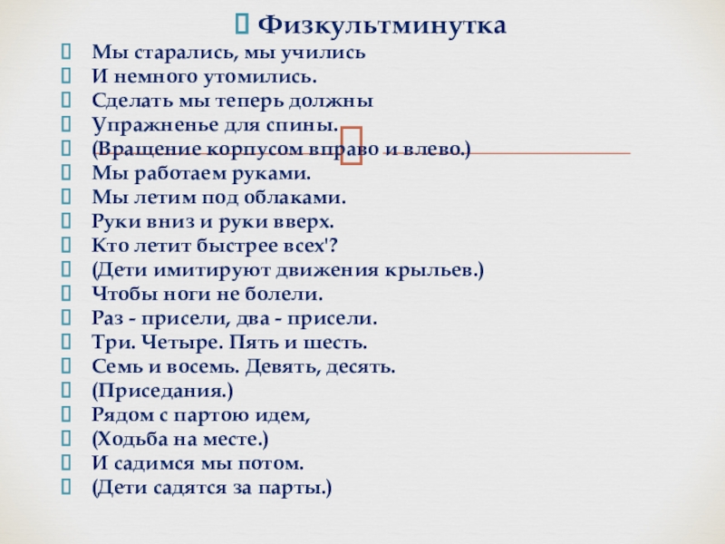 ФизкультминуткаМы старались, мы училисьИ немного утомились.Сделать мы теперь должныУпражненье для спины.(Вращение корпусом вправо и влево.)Мы работаем руками.Мы