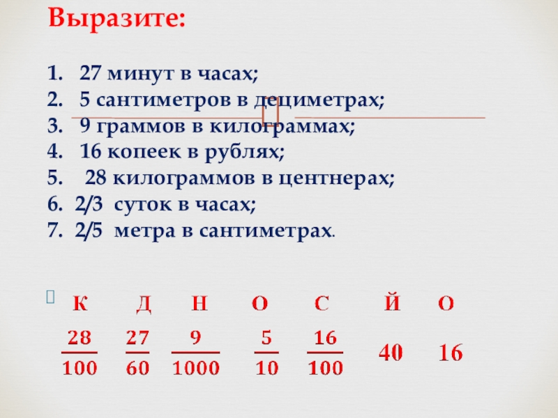 3. 9 граммов в килограммах; 4. 16 копеек в рублях; 5. 28 килограммов в центнерах; 6. 2/3 суток в часах; 7. 2/5 метра в сантиметрах.