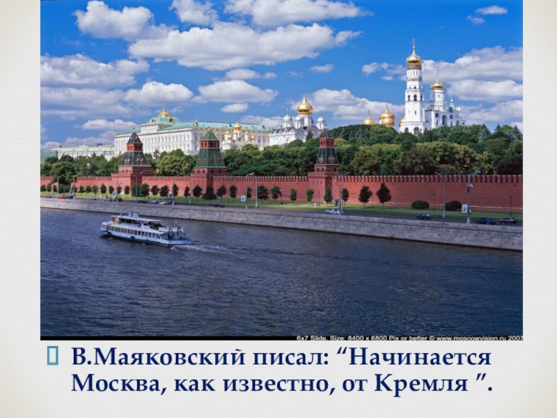 Слайд 5В.Маяковский писал: “Начинается Москва, как известно, от Кремля ”.