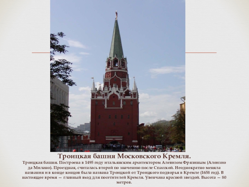 Слайд 13Троицкая башня Московского Кремля. Троицкая башня. Построена в 1495 году итальянским архитектором