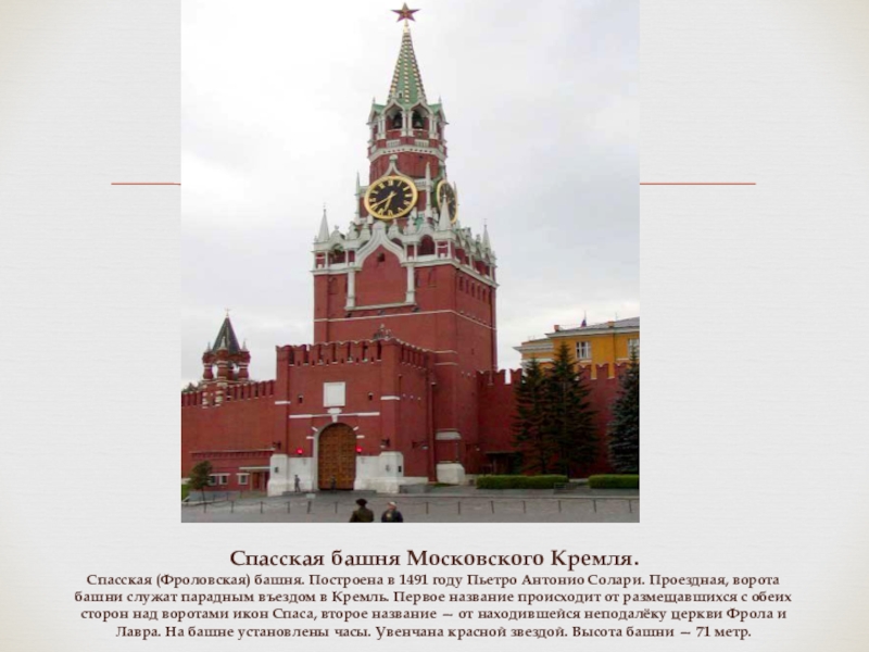 Спасская башня Московского Кремля.  Спасская (Фроловская) башня. Построена в 1491 году Пьетро Антонио Солари. Проездная, ворота