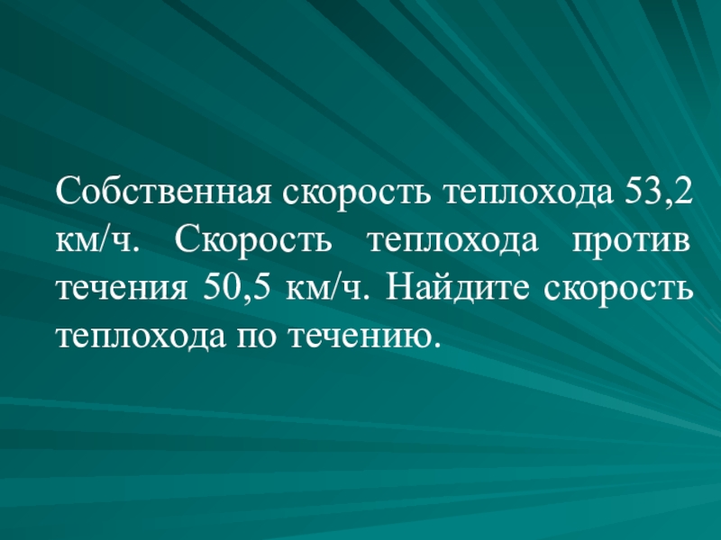 Слайд 15Собственная скорость теплохода 53,2 км/ч. Скорость теплохода против течения 50,5 км/ч.