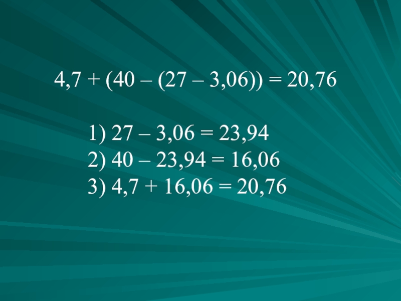 Слайд 124,7 + (40 – (27 – 3,06)) = 20,76