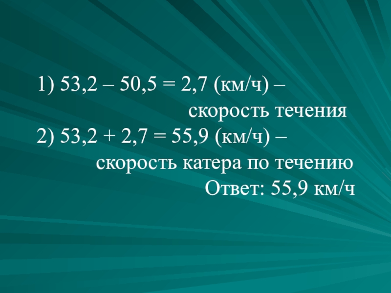 2) 53,2 + 2,7 = 55,9 (км/ч) –