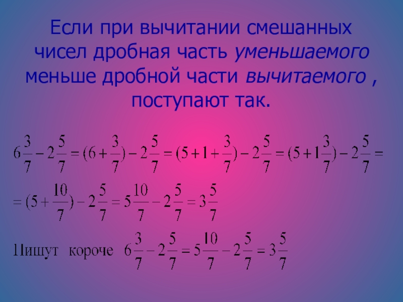 Слайд 11Если при вычитании смешанных чисел дробная часть уменьшаемого меньше дробной части