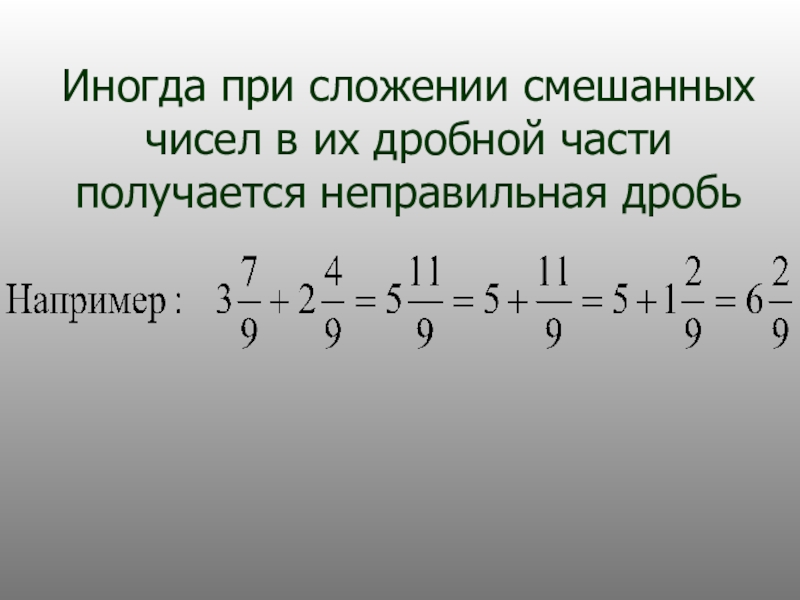 Слайд 10Иногда при сложении смешанных чисел в их дробной части получается неправильная