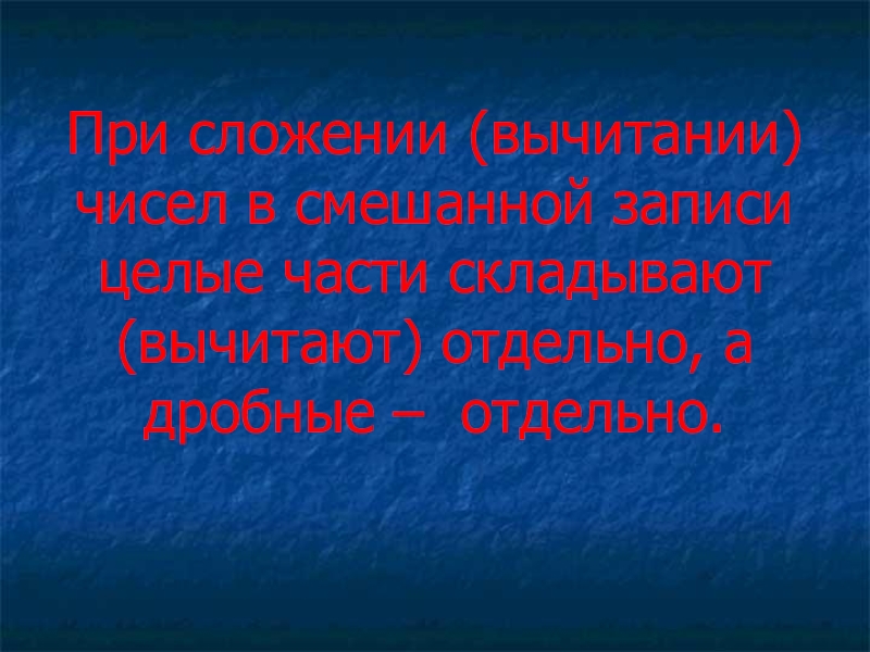 Слайд 9При сложении (вычитании)чисел в смешанной записи целые части складывают (вычитают) отдельно,