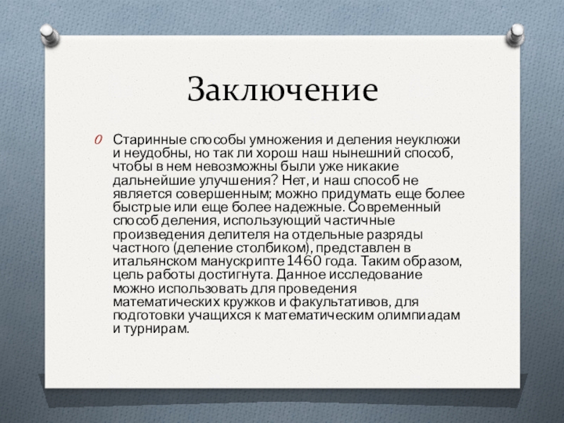 хорош наш нынешний способ, чтобы в нем невозможны были уже никакие дальнейшие улучшения? Нет, и наш способ не является совершенным; можно придумать еще более быстрые или еще более надежные. Современный способ деления, использующий частичные произведения делителя на отдельные разряды частного (деление столбиком), представлен в итальянском манускрипте 1460 года. Таким образом, цель работы достигнута. Данное исследование можно использовать для проведения математических кружков и факультативов, для подготовки учащихся к математическим олимпиадам и турнирам.