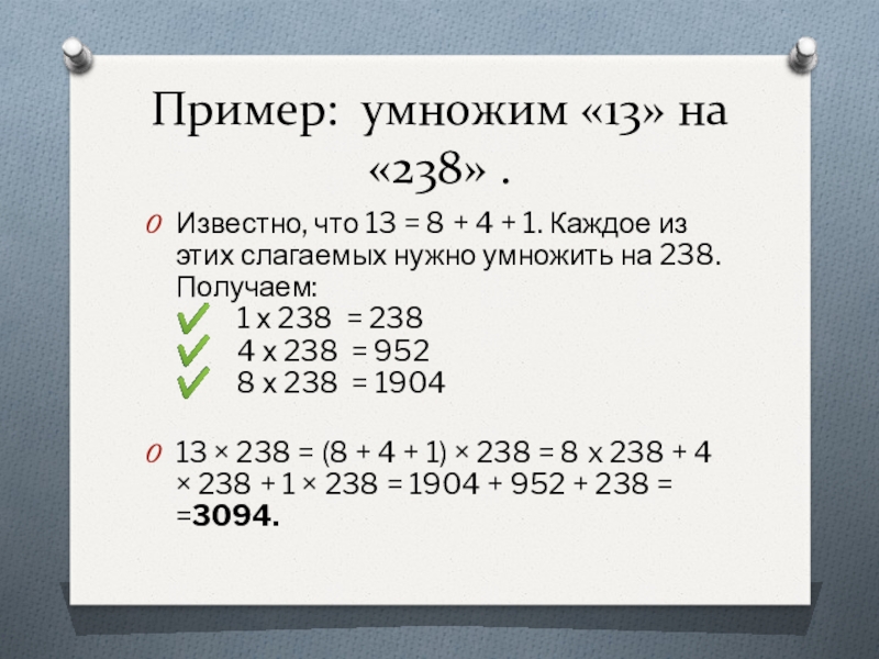 Слайд 20Пример: умножим «13» на «238» .