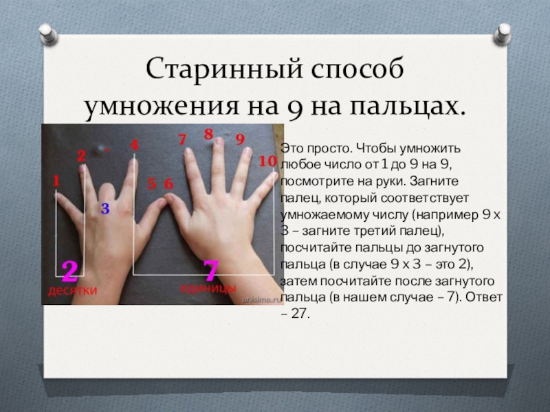 число от 1 до 9 на 9, посмотрите на руки. Загните палец, который соответствует умножаемому числу (например 9 x 3 – загните третий палец), посчитайте пальцы до загнутого пальца (в случае 9 x 3 – это 2), затем посчитайте после загнутого пальца (в нашем случае – 7). Ответ – 27.