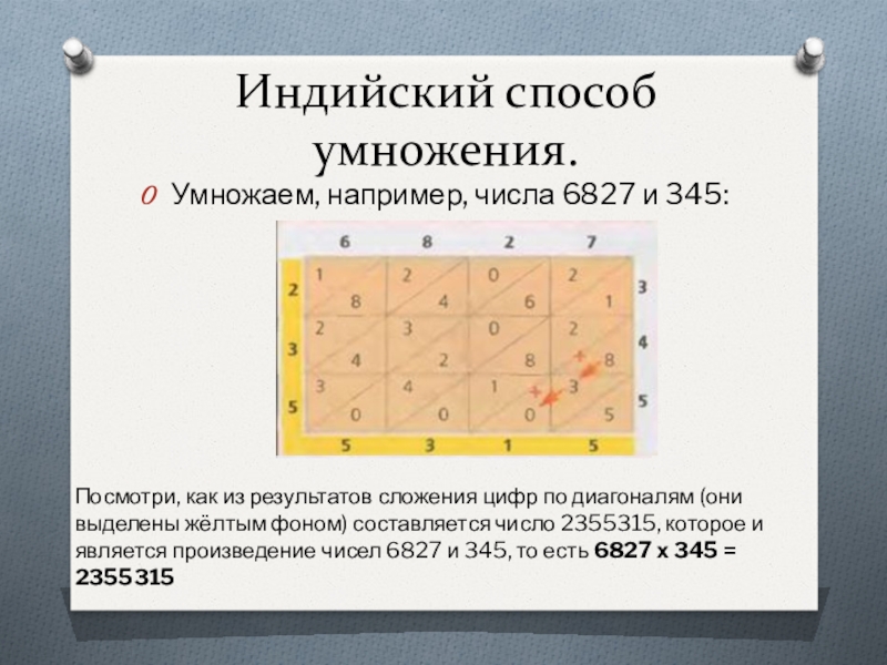 сложения цифр по диагоналям (они выделены жёлтым фоном) составляется число 2355315, которое и является произведение чисел 6827 и 345, то есть 6827 х 345 = 2355315