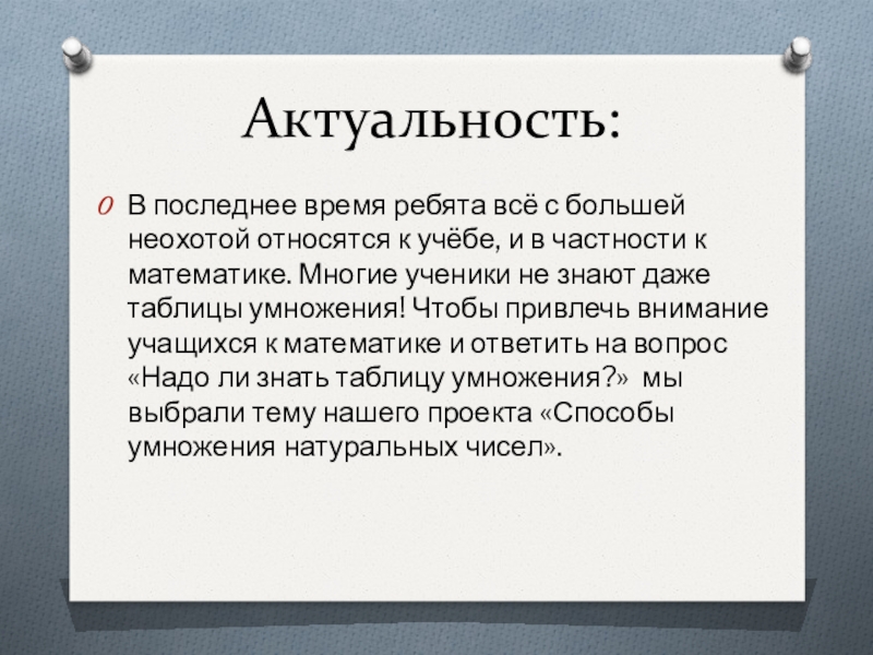 учёбе, и в частности к математике. Многие ученики не знают даже таблицы умножения! Чтобы привлечь внимание учащихся к математике и ответить на вопрос «Надо ли знать таблицу умножения?» мы выбрали тему нашего проекта «Способы умножения натуральных чисел».