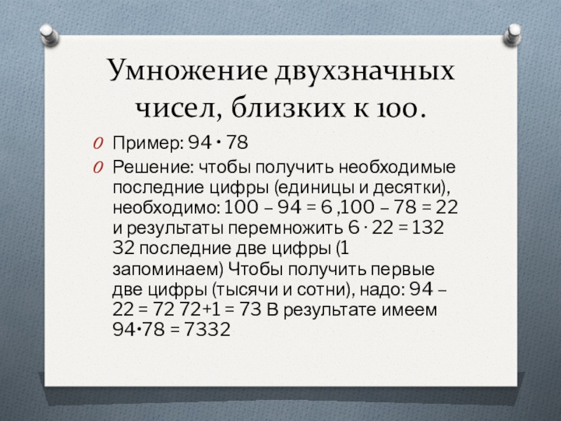 получить необходимые последние цифры (единицы и десятки), необходимо: 100 – 94 = 6 ,100 – 78 = 22 и результаты перемножить 6 · 22 = 132 32 последние две цифры (1 запоминаем) Чтобы получить первые две цифры (тысячи и сотни), надо: 94 – 22 = 72 72+1 = 73 В результате имеем 94•78 = 7332