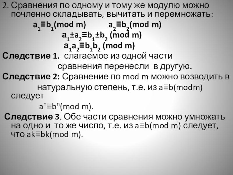 Слайд 72. Сравнения по одному и тому же модулю можно почленно складывать,