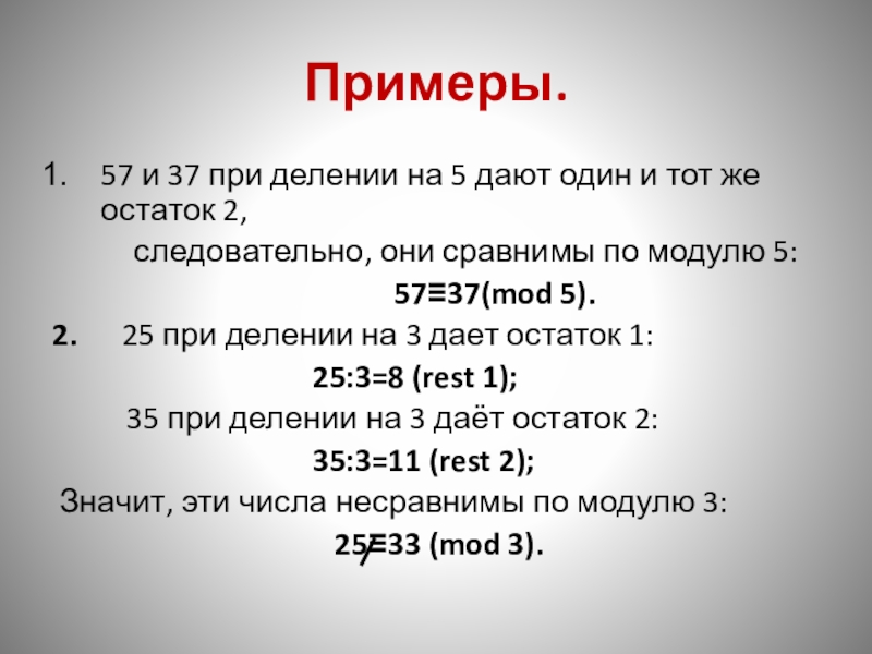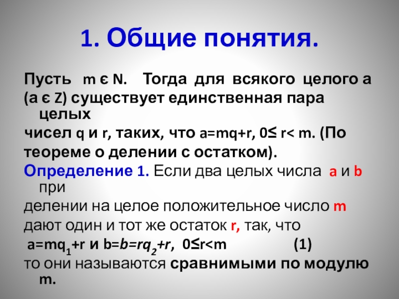 a=mq1+r и b=b=rq2+r, 0≤rто они называются сравнимыми по модулю m.