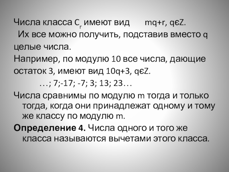 Слайд 11Числа класса Cr имеют вид mq+r, qєZ.