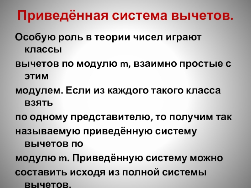 Слайд 17Приведённая система вычетов.