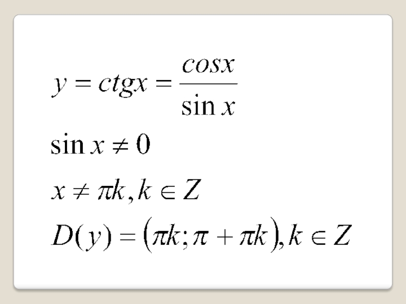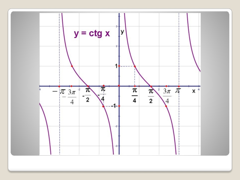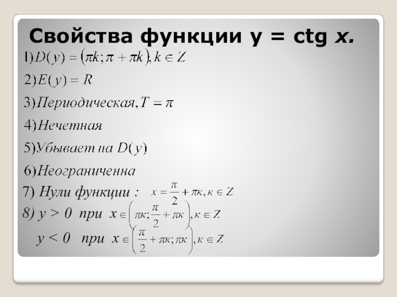 Свойства функции у = сtg x.7) Нули функции : 8) у > 0 при х у <