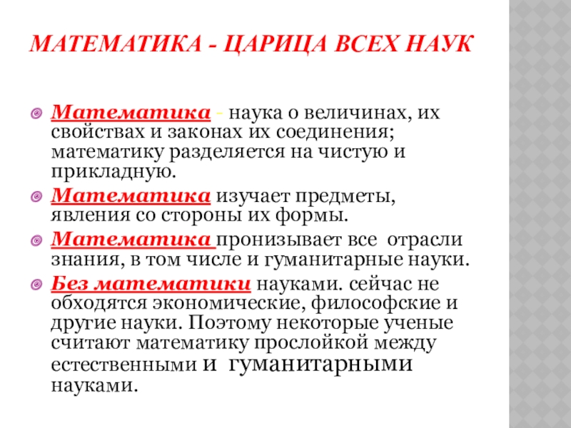 Без математики науками. сейчас не обходятся экономические, философские и другие науки. Поэтому некоторые ученые считают математику прослойкой между естественными и гуманитарными науками.